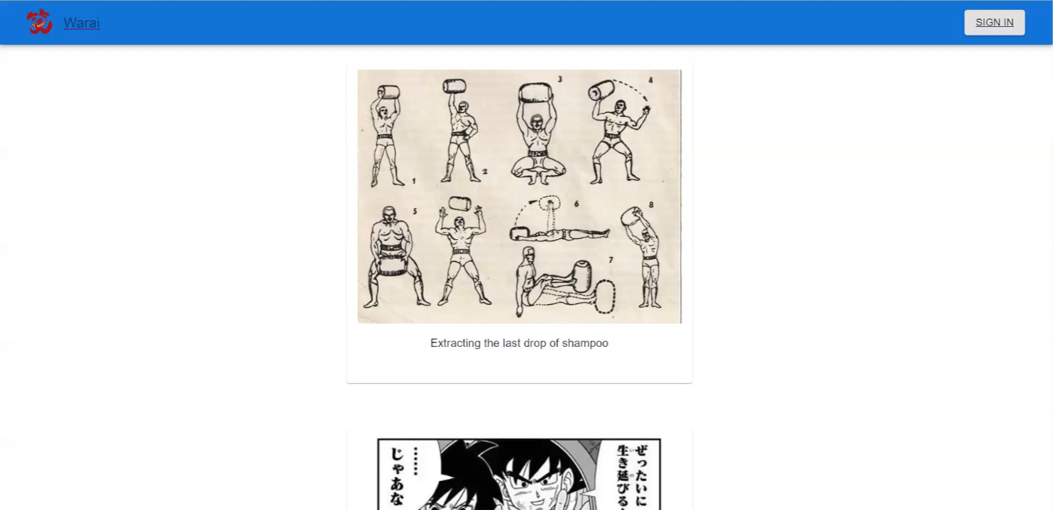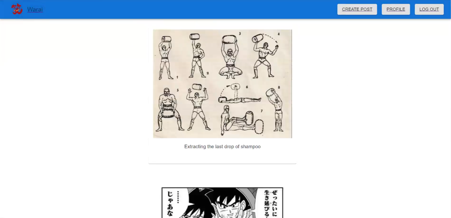 The landing page or the main page is the first page a user arrives at when they visit the website. This page contains a list of all posts in a column, showing the post's image and the top rated caption below the image.